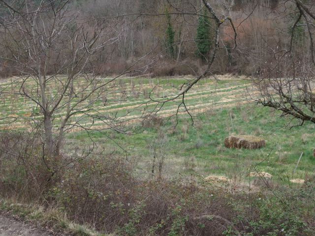 Voilà le jardin ce matin. On distingue sur la gauche les lignes paillées. Sous la paille il y a du compost. On attend que le soleil revienne pour mélanger tout ça afin de planter dans de belles rangées au printemps.