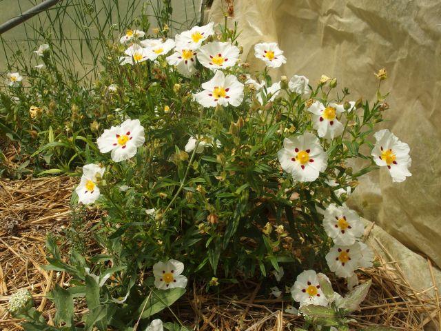 Cyste ladanifère qui se plait bien sous la serre. On commencera à la récolter d’ici deux ans.