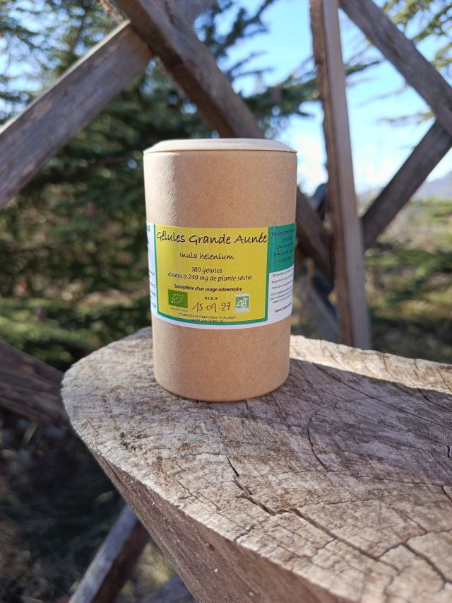 Ingrédients : Gélules d’origine végétale, Poudre de *Grande Aunée (dosée à 249 mg de plante sèche par gélule) *Produit issu de l’agriculture biologique certifié par FR-BIO-01