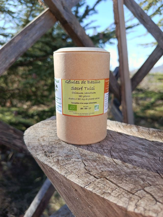 Ingrédients : Gélules d’origine végétale, *Poudre de Basilic Sacré Tulsi (dosée à xx mg de plante sèche par gélule) *Produit issu de l’agriculture biologique certifié par FR-BIO-01
